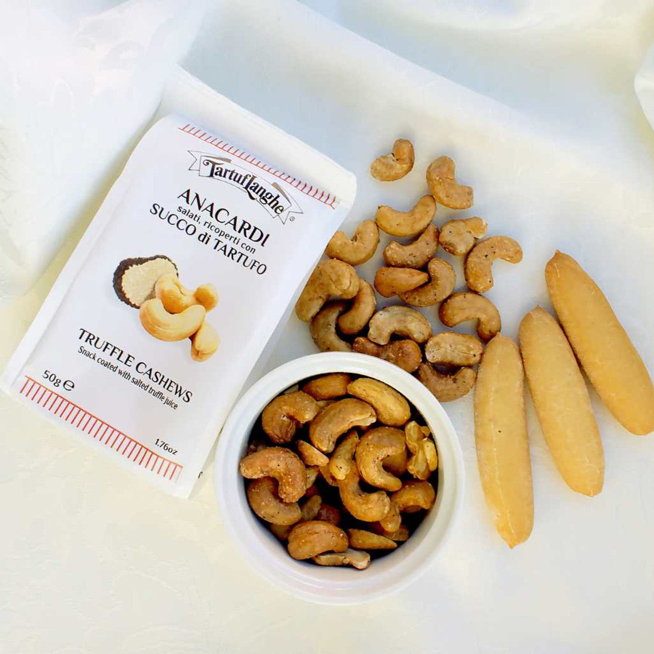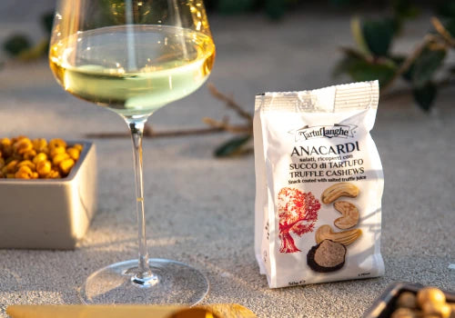 Tartuflanghe truffle cashews are a unique taste experience. These delicious cashews are roasted and salted, then covered with a thin layer of truffle juice, creating an irresistible combination of flavours. Perfect for any occasion, these savoury truffle snacks add a touch of sophistication to your aperitifs. Tartuflanghe truffle cashews are the perfect accompaniment to a glass of wine or a cocktail. Their crunchiness and the intense flavour of truffles also make them perfect as a gourmet snack to be enjoyed at any time. Not just a simple snack, but a luxurious experience for the palate.